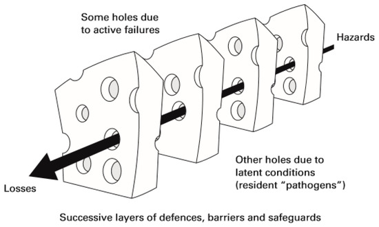 “Swiss Cheese” risk model of James Reason [7]. Source: Reason, J.T.; Carthey, J.; Leval, M.R. Diagnosing “vulnerable system syndrome”: An essential prerequisite to effective risk management. Qual. Health Care 2001, 10, ii21–ii25.