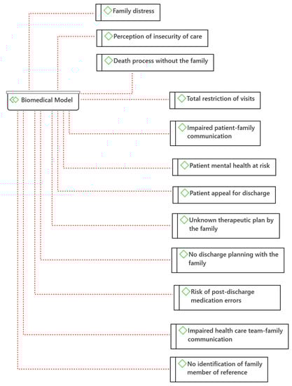 The Biomedical Model of health and disease has the assumption that all health-disease conditions are explained by physiological abnormalities. This model does not consider social and psychological factors as relevant [16]. A total of 12 categories were identified in the biomedical model: Total restriction of visits; Impaired patient-family communication; Patient mental health at risk; Patient appeal for discharge; Family distress; Unknown therapeutic plan by the family; No discharge planning with the family; Risk of post-discharge medication errors; Impaired health care team-family communication; Perception of insecurity of care; No identification of family member of reference; Death process without the family (Figure 3). According to James Reason’s Risk Model (2001), categories compatible with Safety Failures were identified, namely: Total visit restriction; Compromised patient-family communication; Mental health of the patient at risk; Patient appeal for discharge; Therapeutic plan unknown to the family; Absence of discharge planning with the family; Risk of post-discharge medication errors; Compromised health care team-family communication; No identification of family member.