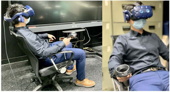 The participants were first brought to a quiet room without outside interference where the computer, the HTC Vive Pro Eye HMD, and the base station were already set up. The HMD and controller were sanitized with tissues sprayed with 75% alcohol every time before applying to participants. The participants were then guided to comfortably sit on a chair facing the base station (Figure 1). The HMD was then put on the patient, and head straps were adjusted to better fit and center the patient’s field of vision. The embedded calibration system was used to calibrate pupil distance and eye-tracking performance for each participant before the examination (Figure 2a–c). If the calibration was not successful, the staff helped the participants adjust the wearing of HMD until the calibration passed. The participants could wear their glasses during the examination and no trial lens was used. Each eye was tested separately without eye patching. During the examination, the participants were asked to stare at the central fixation point, which was a green cross (Figure 2d), and to press the controller whenever they saw a visual stimulus. Position change or head movement was allowed. The participants were asked to fill out a user survey after completing the examination without the accompany of working staff. The operating difficulty, comfortability, time perception, concentration, and overall satisfaction were quantified using a Likert scale from 1 (worse) to 5 (best).