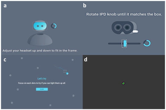 Demonstration of LUXIE/HTC Vive Pro Eye examination from the inside view. (a) Calibration of the headset position. (b) Calibration of the pupil distance. (c) Calibration of the eye-tracker (d), Demonstration of the central fixation green cross with a surrounding arc that will eventually become a circle along with the process of the test.