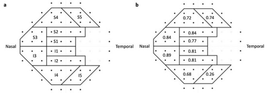 The retinal sensitivities of LUXIE and HFA3 were averaged in global, each hemifield, each quadrant, and each glaucoma hemifield test (GHT) sector and analyzed with Pearson’s correlation coefficients (r). The retinal sensitivities of the 76 test locations in LUXIE and HFA3 were also analyzed with Pearson’s correlation coefficients individually. GHT sectors were defined as shown in Figure 3a [5]. Pearson’s correlation coefficients r ≥ 0.7 were defined as strong correlations; 0.4 ≤ r < 0.7 were defined as moderate correlations; r < 0.4 were defined as weak correlations [6]. Continuous variables were compared using the paired-sample t-test. All statistical analyses were performed using SPSS version 19.0 (IBM, Armonk, NY, USA) for Windows; p < 0.05 was considered statistically significant.