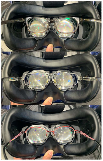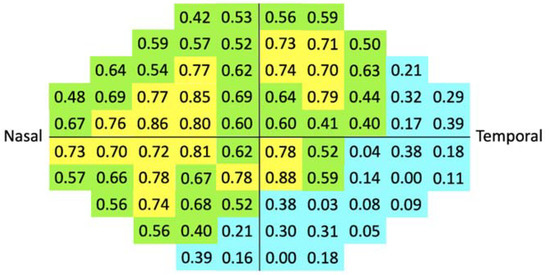 In the current study, the correlation was moderate to weak in the inferior and temporal fields. As shown in Figure 4, the more inferior and temporal, the weaker the correlation. The reason for this trend is unclear, but possible explanations are as follows. First, the variability of the retinal sensitivity was higher in the peripheral visual field. It has been reported that the 30-2 Humphrey visual field, which contains the peripheral 24°–30° test locations, had higher variability than the 24-2 Humphrey visual field [17]. Other studies also showed that the variability increased rapidly as the observed sensitivity decreased. Peripheral test locations generally had lower sensitivities and therefore higher variability [18,19]. Second, our participants were allowed to wear their glasses during the test. The glasses frames might be pushed upward by the HMD during the test, which may affect the test results of lower or temporal VF (Figure 6) [20].