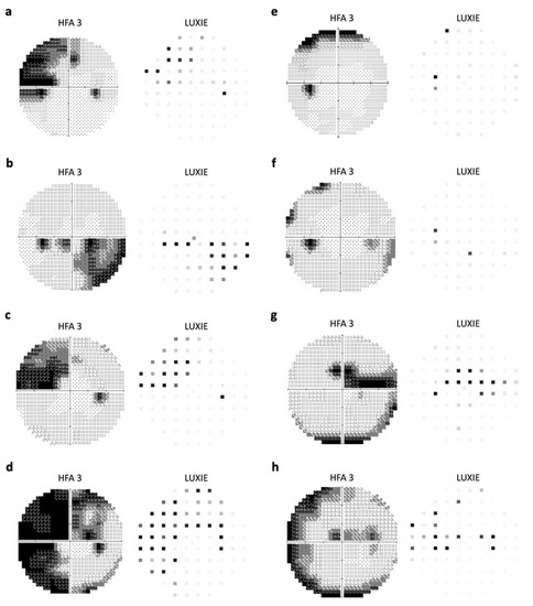 Examples of visual field grayscale maps generated by Humphrey Field Analyzer 3 (HFA3) and LUXIE. (a) Superonasal visual field defect. (b) Inferonasal visual field defect. (c) Superonasal visual field defect. (d) Superior arcuate scotoma and inferior nasal step. (e) Superior rim defect on HFA3. (f) Inferior nasal step; temporal rim defect on HFA3. (g) Superior arcuate scotoma; inferior rim defect on HFA3. (h) Superior arcuate scotoma; rim defect on HFA3.
