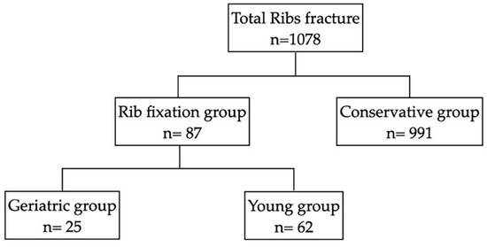 During the study period, a total of 1078 patients with RF were admitted to our hospital. Overall, 87 patients received RF fixation, and the other patients underwent conservative management (Table 1). The study diagram is presented in Figure 2.