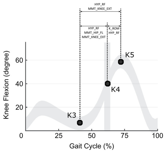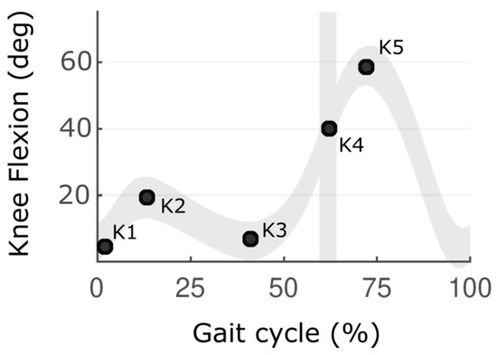 Knee kinematics in sagittal plane. [K1] Knee position at initial contact; [K2] maximum knee flexion at initial stance; [K3] Minimum knee position during terminal stance; [K4] Knee position at toe off; [K5] Maximum knee flexion during swing phase.