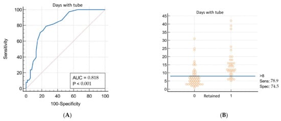Multivariable logistic regression analysis (Table 2) identified, as independent predictors of RH, sternum fracture (OR 7.96, 95% CI 1.16–54.79; p = 0.035), pre-admission desaturation (OR 0.96; 95% CI 0.77–0.96; p = 0.009), and the number of TT maintenance days (OR 1.22; 95% CI 1.09–1.37; p = 0.0005). Analysis suggests that in the case of SpO2 < 90% a Relative Risk (RR) of development of RH of 1.16. Receiver operating characteristic (ROC) curves were constructed to determine cut-off values of continuous variables. As shown in Figure 2, when considering pre-admission SpO2, the optimal cut-off was 90% (sensitivity: 38.7%; specificity: 88.9%) with an area under the curve (AUC) of 0.659 (p = 0.015). In the case of total TT duration days, the RR of development of RH is 1.22. The AUC of ROC curve, as reported in Figure 3, is 0.818 (p < 0.0001), with a cut-off of 8 days (sensitivity: 78.8%; specificity: 74.4%).