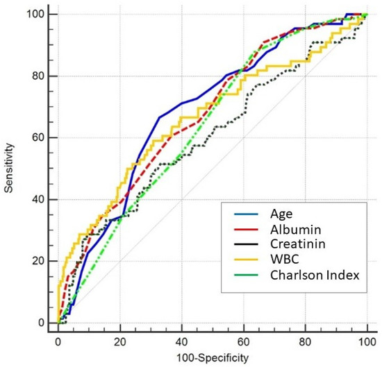Receiver operating characteristic (ROC) analysis for age, creatinine, albumin, white blood cell count (WBC), and Charlson comorbidity index (CCI) at admission for all-cause in-hospital death. ROC areas under the curve: age, 0.684 (0.640–0.726); creatinine, 0.675 (0.631–0.717); WBC, 0.665 (0.620–0.707); albumin, 0.675 (0.631–0.717); and CCI 0.637 (0.592–0.681).