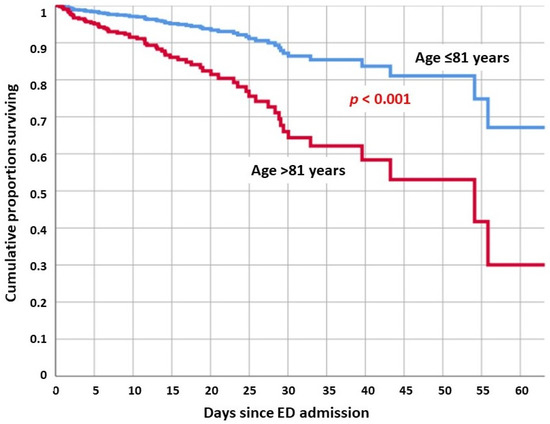 Adjusted cumulative survival of CDI patients according to age divided by the cutoff value of 81 years indicated by the ROC analysis Youden index (J). Adjusted mortality was about threefold higher in older patients regardless of comorbidities and other clinical covariates.