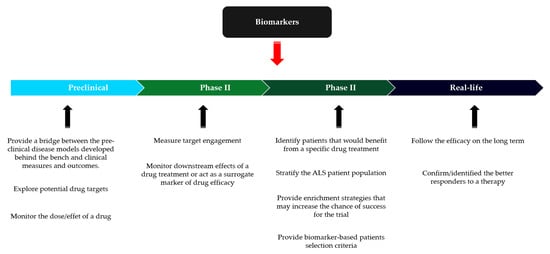 Consideration of the heterogeneity of ALS has led to a reassessment of the design of therapeutic trials. There have been notable developments in enrichment strategies based on the selection and stratification of patients who are more likely to show a better response to treatment in trials. They are based on prognostic clinical variables such as the rate of disease progression, diagnostic delay, or biological characteristics such as a causative genetic mutation or a predictive biomarker profile [121]. These approaches are now more widely accepted in FDA guidelines [122], but they inevitably limit extrapolation of their efficacy to heterogeneous populations found in real life. An example is edaravone, which was approved by the FDA, although modest efficacy was found only in certain forms diagnosed at an early stage and not very severely impaired [3]. The development of a validated biomarker is currently one of the most active research areas on ALS. Several studies focus on the development of diagnostic, prognostic, or predictive biomarkers that could partially explain some of the reasons for heterogeneity, define different ALS biotypes, help stratify patients and facilitate the prediction of subgroups of patients who respond to treatment [123,124,125]. The utility of biomarkers in drug development in ALS spans from preclinical models, with translational biomarkers, to real-life studies (Figure 2). Several candidate biomarkers have been explored, such as biological biomarkers (neurofilaments in cerebrospinal fluid (CSF) and plasma [126], miRNAs), neurophysiological (Motor Unit Number Estimation (MUNE), Motor Unit Number Index (MUNIX) [127], electrical impedance myography (EIM), transcranial magnetic stimulation (TMS) [128]), neuroradiological (diffusion tensor imaging, functional MRI, iron-sensitive sequences, voxel-based morphometry [129]), and digital (accelerometry, quantified acoustic analysis of dysarthria [130]). It is hoped that these biomarkers will replicate the effective development process achieved in multiple sclerosis thanks to MRI, which has allowed sufficiently promising therapeutic molecules to be selected in short phase II trials [131,132,133]. However, it is necessary to draw a lesson from therapeutic developments in Alzheimer’s disease. While anti-amyloid antibodies showed impressive efficacy on amyloid plaque burden in the PET scan, they showed no clinically significant or at best marginal effect in the phase III clinical trial [134].