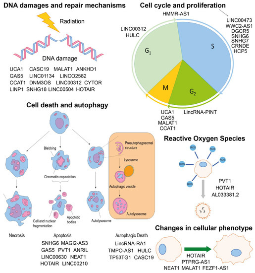 lncRNAs in different processes associated with radioresponse, including: DNA damages and repair mechanism, cell cycle and proliferation, cell death and autophagy, regulation of reactive oxygen species (ROS), and changes in cellular phenotype.