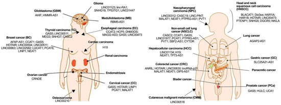 Examples of known lncRNAs with diagnostic potential in cancers are summarized in Figure 2 and Table 1.
