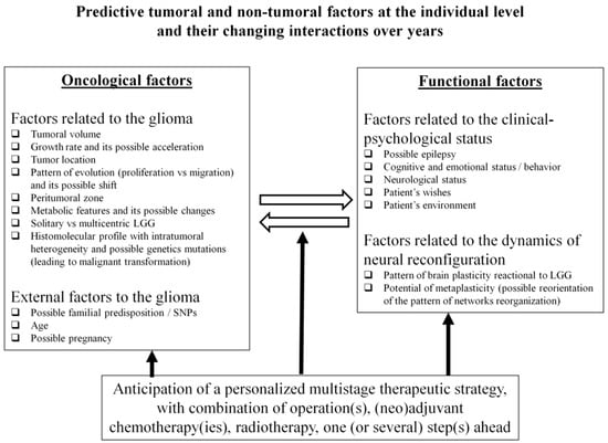 Consequently, in order to elaborate a multistage longitudinal personalized approach, it is of utmost importance to predict how the glioma will progress, in terms of possible changes in its growth rate, pattern of migration, genetic mutation, etc., and how the brain will adapt through changes in its pattern of spatiotemporal redistribution or possible functional consequences such as epilepsy or cognitive decline, etc. Indeed, because diffuse LGG inevitably recurs, and because the therapeutic armamentarium is not inexhaustible, the main goal in this respect if to anticipate the requirements of individualized management. In this way, practitioners can remain one step ahead in order to select the optimal surgical and/or medical oncological (re-)treatment(s)—some of them possibly kept in reserve for years—at the appropriate time in the evolution of this chronic disease, before MT and before clinical worsening. The purpose of this current study is to review tumoral and non-tumoral predictive factors, as well as their interactions, which might be helpful to guide individual decisions months or years in advance, to establish personalized multistep strategies for LGG patients who currently have a life expectancy of over 15 years [12,26].