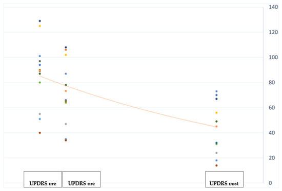 Jittered scattered plot showing the preoperative OFFmed and ONmed (left) and postoperative ONstim (right) UPDRS values of the 14 patients in the study. The difference between the preoperative OFFmed and ONmed values was not significant (p = 0.11), while the difference between the preoperative ONmed and postoperative ONstim showed a p-value = 0.00221. The line shows the negative trend of the values.