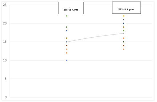 Jittered scattered plot showing the preoperative (left) and postoperative (right) attentional impulsiveness subscore of the BIS-11. The difference between the preoperative ONmed and postoperative ONstim showed a p-value = 0.050. The line shows the positive (worsening) trend of the values.