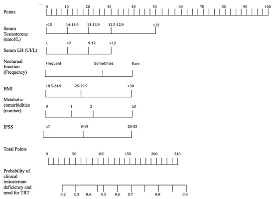 The selection of hypogonadal patients who really need and can benefit from TTh is challenging. In case of a total testosterone level below 12 nmol/L, the indication for TTh is clear, and patients experience clinical benefits. This data was recently confirmed by a meta-analysis that showed that TTh only improved libido and erectile function in hypogonadal subjects with significantly reduced T levels (<8 nmol/L and <12 nmol/L, respectively) [21]. In daily clinical practice, however, we often face patients with testosterone levels ranging between normal–low levels and presenting TD symptoms, in whom it is more difficult to establish whether TTh is really necessary and will benefit the patient. Zitzmann et al. reported that TD symptoms may be seen with total testosterone levels as high as 15 nmol/L [17], and patients can benefit from TTh. Behre et al. demonstrated that 6 months of TTh enhanced body composition and quality of life in men aged 50–80 years with hypogonadal symptoms and total testosterone of 515 nmol/L [22]. These men showed further enhancements in body composition and QoL over the following 12 months of TTh. Other authors reported that patients of <40 years of age with total testosterone <400 ng/dL (13.9 nmol/L) had an increase in hypogonadal symptoms after TTh [23]. Indeed, it was this mixture of observations that led to the development and validation of the TRACE nomogram. Many men report unspecific symptoms such as decreased energy and motivation, depressed mood, poor concentration, sleep disturbances and increased body fat [9]. Patients commonly do not pay attention to these symptoms, which could be the first clinical manifestation of androgen deficiency. The appearance of other symptoms of androgen deficiency, such as the lack of nocturnal erections, should lead to T evaluation and consideration of TTh. Recently, Burte C et al. presented the Francophone Society of Sexual Medicine (SFMS) and the French Association of Urology (AFU) recommendations for the management of TD, highlighting disappearance of nocturnal erections as an important symptom of androgen deficiency [24]. On the other hand, a disrupted central nervous system hypothalamo-pituitary network coordination could be the reason for a disturbed neurogenically organized sexual response in aging males [25]. Moreover, TTh has an impact on mood and other androgen deficiency-related symptoms, especially in middle-aged hypogonadal men. We therefore included evaluation of LH levels in our nomogram. In aging men, Leydig cells show structural and functional alterations with an increasingly oxidative intracellular environment and reduced androgen synthesis and serum T levels [25]. Recently, Liang et al. reported that LH has a strong correlation with hypogonadism, suggesting that an increased LH level might be used as an early predictor of forthcoming symptomatic hypogonadism [26]. The same authors showed that patients with higher LH levels also have a higher IPSS score and lower IIEF-5 score, thereby highlighting the role of LH as an independent predictor of worsening IPSS and IEF-5 score. Interestingly, no association had been reported between psychological symptom and total testosterone or LH levels. It is well known that metabolic syndrome and hypogonadism are associated with increased risk of cardiovascular disease [27]. Moreover, some authors recommend TTh in these patients, as long-term therapy with testosterone in men with functional hypogonadism and sexual symptoms reduces obesity parameters, and improves metabolic syndrome and health-related QoL [27,28]. On the basis of these considerations, our nomogram included biochemical, as well as clinical parameters.