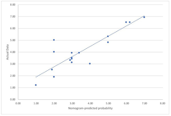 The concordance index between data obtained from the score and the real data was 0.81 after using bootstrapping to correcting for over-fitting. Calibration plots of the nomogram-predicted probabilities and the improvement in clinical questionnaires and PROs I in the external cohort are displayed in Figure 2.