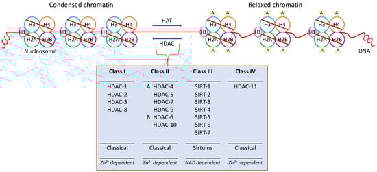 The regulation of transcription is controlled by the acetylation status of histones. The competition between the histone deacetylases (HDACs) and the histone acetyltransferases (HATs) plays a crucial role in either the inhibition or the promotion of transcription, respectively [1,2]. The HDAC-dependent removal of acetyl groups from lysine residues in histones leads to the formation of heterochromatin, thus repressing the process of transcription [3]. A large number of human HDACs has been found and recognized. HDACs are divided into four classes depending on their structure and function [4], and are further subdivided into NAD-dependent (III) and Zn2+-dependent classes (I, II, and IV). Class I includes HDAC-1, -2, -3, and -8; class II consists of HDAC-4, -5, -7, -6, -9, and -10, whereas class IV only contains HDAC-11. Class III HDACs are widely known as sirtuins and contain seven distinct members: SIRT-1–7 (Figure 1) [5,6,7].