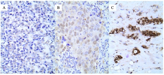 Only 4 (3.4%) out of 118 cases did not show HDAC-2 expression (Figure 2A). In all other HDAC-2-positive cases, the pattern of distribution was nuclear (Figure 2B,C), whereas non-cancerous sites of the tissues were negative for HDAC-2. The mean immunohistochemical expression of HDAC-2 was 5.02 (SD = 2.71), with 22 cases (18.6%) exhibiting high immunohistochemical expression (Figure 2C).