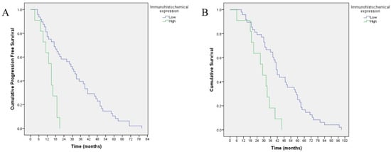 The mean DFS for all patients was 28.6 months (SD = 1.8), with a median DFS of 21 months, while the mean OS was 42.2 months (SD = 2.0), with a median OS of 40 months. Kaplan–Meier estimates for both DFS and OS were significantly different for low versus high HDAC-2-expressing BC (log-rank test, p < 0.001) (Figure 3).