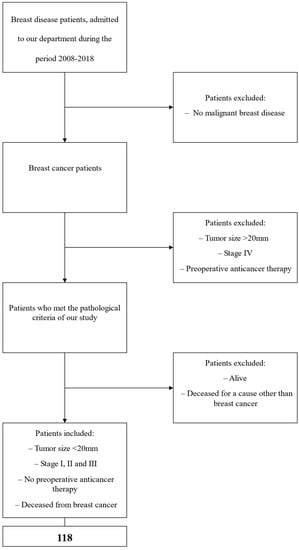 Patient-derived BC tumor samples with a diameter less than 20 mm were obtained from female patients that had undergone R0 surgical resection (R0 resection: no cancer cells seen microscopically at the margin of the resection) of breast tissue during the period 2008–2018. Only deceased, pre-operatively treatment-naïve, stage I–III BC patients were included in the study. Stage IV BC patients, patients with tumor size >20 mm, neoadjuvantly-treated patients, and patients whose death was associated with any reason not directly linked to BC were excluded from the study. The staging of the tumor was evaluated using the 7th edition of the American Joint Committee on Cancer (AJCC) Grouping system and the Tumor, Node, Metastasis (TNM) system [56]. A total of 118 patients meeting the aforementioned criteria were selected to be evaluated in our study (Scheme 1). The period of time from the date of surgery until death caused by BC was defined as the overall survival (OS) period. Disease-free survival (DFS) period was defined as the time interval between initial diagnosis and disease recurrence. All patients included in this study had given written informed consent for the evaluation of their clinical information and biological specimens. The study was approved by the Ethical Committee of the Medical School of the National and Kapodistrian University of Athens (Approval ethic code: 1718004914).
