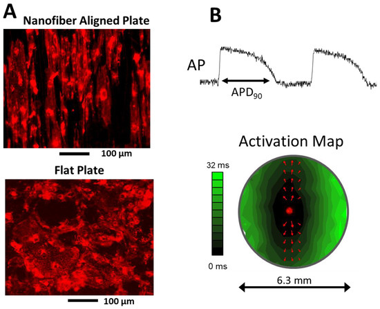 Monolayers were cultured on 3D nanofiber-aligned 96-well plates to obtain a more mature structure (Figure 1A, top) compared to standard flat 96-well plates (Figure 1A, bottom). Monolayers were stimulated with an infrared (IR) laser (1464 nm diode laser) at a cycle length of 0.5 Hz during which simultaneous multi-site (280) action potentials were recorded at room temperature using the voltage sensitive dye Fluovolt (Sigma) as described previously [23]. High-resolution maps of local conduction velocity (CV) vectors at each recording site were determined, from which mean CV in the direction longitudinal to fibers (Figure 1B, red arrows) was determined. Action potential duration (APD) at 90% repolarization (Figure 1B, top, APD90) was also determined at each site, and the average across all sites was reported.
