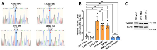 (Panel A) shows the DNA-sequencing results for control (CNTL) human iPSCs and patient S358L iPSCs and differentiated CNTL cardiomyocytes (CM) and S358L CM. (Panel B) shows the mRNA expression of TMEM43 in CNTL and S358L iPSCs (n = 4) and differentiated MSC (n = 3) and CM (n = 3). (Panel C) shows that TMEM43 protein was highly expressed in bone marrow (BM) MSC, CNTL and S358L iPSC differentiated MSCs. (* p < 0.05; ** p < 0.01; ns, nonsignificant).