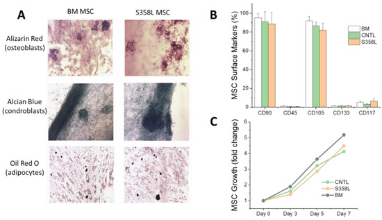 (A) shows the multi-lineage potential of bone marrow (BM) MSCs (as a positive control) and MSCs derived from S358L iPSCs. Both BM and S358L MSCs are shown to have a similar potential for differentiation into to bone (stained with Alizarin Red), cartilage (stained with Alcian Blue) and fat (stained with Oil Red O). (B,C) show that BM MSCs and MSCs derived from S358L iPSCs and control (CNTL) iPSCs have a similar cell surface marker expression and growth rate, respectively (n = 3 for all).