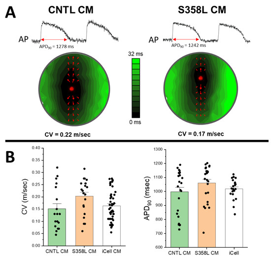 Representative examples of action potentials and activation maps (A) recorded during IR pacing at 2000 ms cycle length from wells with cardiac myocytes (CM) alone that were derived from control (left, CNTL) and S358L (right) iPSCs. Action potentials and activation maps show a similar APD90, activation pattern, and conduction velocity (red arrows) for CNTL CM and S358L CM. Summary data (B) show CV (left) and APD90 (right) measured for each well over multiple differentiations (for iPSC derived CM) and vials (iCells). No significant differences were observed for CV and APD90 across all groups. For CV: CNTL CM, n = 18; S358L CM, n = 21, iCell CM n = 47. For APD90: CNTL CM n = 25; S358L CM, n = 25; iCell CM, n = 22.