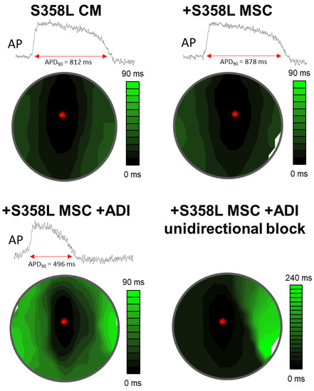 Representative action potential traces and activation maps for S358L cardiac myocytes (CM) alone (top left), or co-cultured with 3358L MSCs (+S358L MSC, top right), or co-cultured with S358L MSCs plus pro-adipogenic factors (+S358L MSC +ADI, bottom). Only with pro-adipogenic factors was shorter APD90 and slower CV (crowding of isochrone lines) observed (bottom left). Additionally, in some examples only with pro-adipogenic factors, unidirectional block was observed (bottom right).