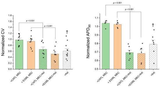 Summary data for conduction velocity (CV, left) and APD90 (right) when S358L cardiac myocytes were co-cultured under early adipogenic conditions. All CV and APD90 values are normalized to values measured in cardiac myocytes alone. Co-culturing with either CNTL (+CNTL MSC, n = 8, n = 6) or S358L (+S358L MSC, n = 11, n = 6) MSCs had no effect on CV or APD90. Only when pro-adipogenic factors were combined with either CNTL (+CNTL MSC +ADI, n = 10, n = 7) or S358L (+S358L MSC +ADI, n = 11, n = 6) MSCs was CV and APD90 significantly reduced compared to the absence of pro-adipogenic factors. Finally, S358L cardiac myocytes cultured with pro-adipogenic factors alone (+Adi, n = 11, n = 7) demonstrated a similar reduction in CV and APD90. (†, p < 0.02 vs. +S358L MSC and +CNTL MSC).