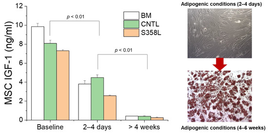 Shown are IGF-1 section levels during adipogenic conditioning of bone marrow (BM) MSCs and MSCs derived from control (CNTL MSC) and S358L (S358L MSC) iPSCs. After 2–4 days of adipogenic conditioning (n = 3, n = 6, n = 6), IGF-1 levels are significantly reduced compared to before adipogenic conditioning was initiated (baseline, n = 3, n = 3, n = 3). After >4 weeks of adipogenic conditioning, when MSCs have differentiated to adipocytes (bottom right, n = 5, n = 4, n = 6), IGF-1 levels are negligible compared to baseline.