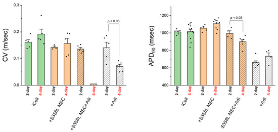 Summary data for conduction velocity (CV, left) and APD90 (right) when iCell cardiac myocytes (iCell CM) were co-cultured under 2 or 4 days of early adipogenic conditioning. Co-culturing with S358L (+S358L MSC) MSCs (orange bars) had no effect on CV or APD90 at 2 or 4 days. Only when pro-adipogenic factors alone (white hatched bars) or when combined with S358L (+S358L MSC + ADI) MSCs (orange hatched bars) was CV and APD90 significantly reduced at 4 days compared to 2 days. For CV: iCell, n = 5, n = 5; +S358L MSC, n = 3, n = 5; +S358L MSC + Adi, n = 5, n = 5; +Adi, n = 5, n = 5. For APD90: iCell, n = 6, n = 12; +S358L MSC, n = 5, n = 9; +S358L MSC + Adi, n = 4, n = 6; +Adi, n = 7, n = 4.