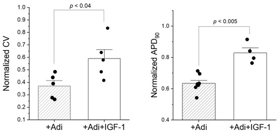 Summary data for conduction velocity (CV, left, n = 5, n = 5) and APD90 (right, n = 8, n = 4) when cardiac myocytes were co-cultured with pro-adipogenic factors that did (solid white bars) and did not (hatched bars) include IGF-1 supplementation. All CV and APD90 values are normalized to values measured in cardiac myocytes alone.