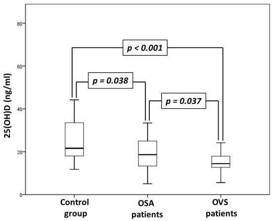 Comparison of 25(OH)D serum levels between control, obstructive sleep apnea syndrome (OSA) and overlap syndrome (OVS) groups.