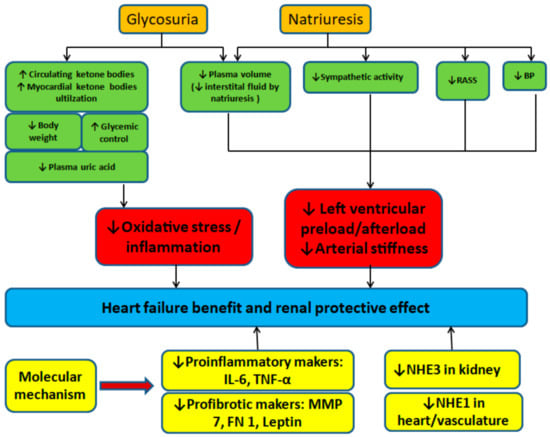 Four SGLT2is (i.e., empagliflozin, dapagliflozin, canagliflozin, and ertugliflozin) are approved by the European Medicines Agency and the US Food and Drug Administration on the basis of large-scale randomized controlled trials (RCTs) and documented cardiovascular benefits. The cardiovascular benefits of SGLT2is are beyond glycemic control. Several mechanisms contribute to the cardioprotective effect of SGLT2is, and they include the reduction in preload and afterload secondary to natriuresis and a decrease in blood pressure, ketone body-based myocardial metabolism, and improvement of myocardial remodeling [46]. Selected mechanisms of HF and renoprotective benefits of SGLT2is are schematized in Figure 1. The antiarrhythmic effect among diabetic patients treated with SGLT2is was also revealed by a population-based cohort study [47].