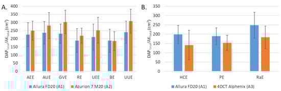 Average field size corresponding to the total dose area product (DAP) on total air kerma at 66 cm ratio (A) between Allura FD20 (A1) and Azurion 7 M20 (A2) for 7 embolization procedures and (B) between Allura FD20 (A1) and 4DCT Alphenix (A3) for 3 embolization procedures (B). Values are expressed as means ± standard deviations (error bars). DAP: dose area product; AK: air kerma; AEE: abdominal elective embolizations for tumors and visceral aneurysms; AUE: abdominal urgent embolizations for active bleedings or vascular injuries of digestive arteries; BE: bronchial artery embolizations; HCE: hepatic chemoembolizations; PE: pelvic embolizations for planned prostatic embolizations; RaE: radioembolisations; RE: renal artery embolizations; UEE: uterine elective embolizations for leiomyomas or vascular malformations; UUE: uterine urgent embolizations for postpartum hemorrhages; GVE: gonadal vein embolization.