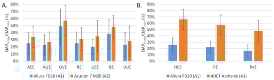 Comparison of the fluoroscopy dose area product (DAP) to total DAP ratio (A) between the Allura FD20 (A1) and Azurion 7 M20 (A2) systems for 7 embolization procedures and (B) between the Allura FD20 (A2) and 4DCT Alphenix (A3) systems for 3 embolization procedures. Values are expressed as means ± standard deviations (error bars). DAP: dose area product; AEE: abdominal elective embolizations for tumors and visceral aneurysms; AUE: abdominal urgent embolizations for active bleedings or vascular injuries of digestive arteries; BE: bronchial artery embolizations; HCE: hepatic chemoembolizations; PE: pelvic embolizations for planned prostatic embolizations; RaE: radioembolisations; RE: renal artery embolizations; UEE: uterine elective embolizations for leiomyomas or vascular malformations; UUE: uterine urgent embolizations for postpartum hemorrhages; GVE: gonadal vein embolization.