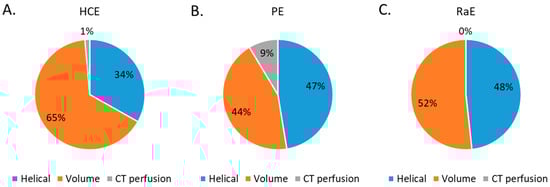 Percentage of CT acquisition types for all 3 embolization procedures. (A) HCE: hepatic chemoembolizations; (B) PE: pelvic embolizations for planned prostatic embolizations; (C) RaE: radioembolisations.