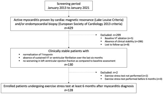 The study population is composed of 128 consecutive patients (mean age 41 ± 9 years, males 70%) undergoing EST at least six months after myocarditis. Patient selection process and excluded cases are shown in Figure 1.
