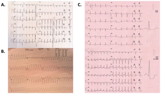 Exercise stress test findings. Representative examples of remarkable findings on exercise stress tests are shown. (Panel (A)). Female patient, 32-year-old, with evidence of frequent polymorphic ventricular ectopies on the effort at exercise stress test performed 12 months after cardiac magnetic resonance-proven acute myocarditis presenting with nonsustained ventricular tachycardia and syncope. After the exercise stress test, he underwent an endomyocardial biopsy and subsequent immunosuppressive treatment for virus-negative lymphocytic myocarditis. (Panel (B)). Male patient, 44-year-old (P123, Table 3) with evidence of sustained monomorphic ventricular tachycardia causing syncope during an exercise stress test performed late after presentation with arrhythmic myocarditis. The subsequent workup is shown in Table 3. (Panel (C)). Male patient, 68-year-old (P37, Table 3) with exercise stress test showing dynamic ST segment depression in inferolateral leads with ST elevation in lead aVR (exercise peak, bottom; compared to baseline, top). He was asymptomatic for angina or dyspnea. After normal coronary angiography, he had both cardiac magnetic resonance and endomyocardial biopsy with a final diagnosis of chronically active myocarditis from parvovirus B19. Further details are reported in Table 3.