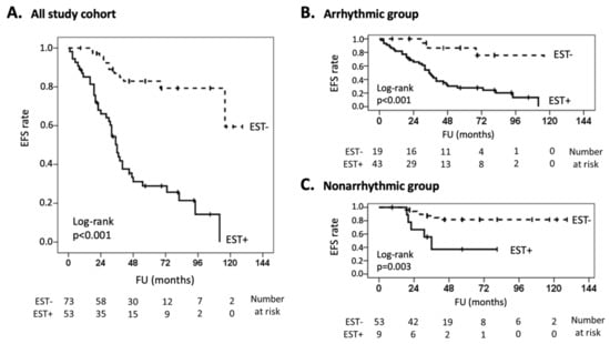 Outcomes after exercise stress test. Kaplan-Meier curves are shown for the occurrence of adverse events after EST. Adverse events included cardiac death, disease-related hospital readmissions, malignant ventricular arrhythmia (sustained ventricular tachycardia, ventricular fibrillation, appropriate implantable cardioverter defibrillator treatment), and active myocarditis, proven by endomyocardial biopsy or myocardial imaging. For each graph, x-axis indicates follow-up months after EST, and y-axis indicates event-free survival. The continuous line refers to patients with EST positive for ventricular arrhythmia or ischemia (EST+), whereas the dashed line refers to patients with uneventful EST (EST-). Numbers at risk are reported below each chart. Curves are shown for the whole patient cohort (panel (A)) and arrhythmic and nonarrhythmic subgroups (panels (B,C), respectively). EFS = event-free survival; EST = exercise stress test; FU = follow-up.