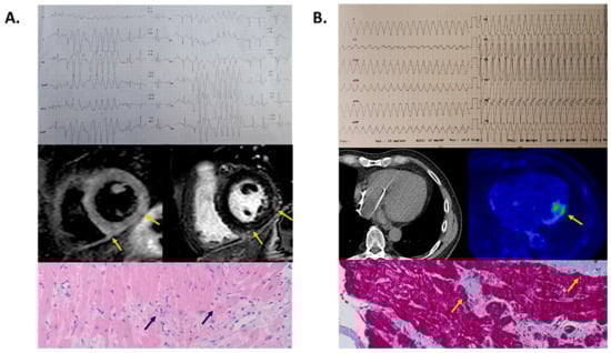 Relationship between exercise stress test-induced ventricular arrhythmia and myocarditis staging. Representative examples of ventricular arrhythmia features on exercise stress test and subsequent myocarditis restaging are shown. (Panel (A)). Female patient, 40-year-old, with evidence of irregular nonsustained ventricular tachycardia immediately after exercise peak on stress test. She underwent cardiac magnetic resonance showing both T2 short-tau inversion recovery (mid panel, left) and late gadolinium enhancement sequences (mid panel, right) involving the subepicardial layer of the inferolateral left ventricular wall (arrows), fulfilling the Lake Louise criteria for active myocarditis. She underwent an endomyocardial biopsy showing multifocal lymphocytic inflammatory infiltrates (lower panel, arrows) confirming the diagnosis of chronically active virus-negative myocarditis, subsequently treated by immunosuppressants. (Panel (B)). Male patient, 66-year-old (P78, Table 3) with evidence of regular and monomorphic sustained ventricular tachycardia causing syncope during an exercise stress test performed late after presentation with arrhythmic myocarditis. Being an implantable cardioverter defibrillator carrier (mid panel, left), he underwent 18F-Fluorodeoxyglucose positron emission tomography (mid panel, right) with physiological glucose uptake in the mid-lateral left ventricular wall (arrow) and no signs of active myocarditis. Consistently, endomyocardial biopsy (lower panel) showed only replacement fibrosis (arrows) and no signs of persistent myocardial inflammation. He successfully underwent catheter ablation of monomorphic ventricular tachycardia (Table 3).