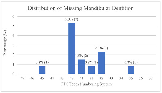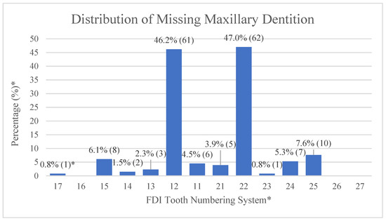 The distribution and frequency of missing teeth. * (1) Tooth numbering is according to the Fédération Dentaire Internationale (FDI) tooth numbering system for maxillary and mandibular dentition. (2) Percentage of missing teeth (missing number of each tooth site/total patient number (132)). (3) Numbers of missing teeth for each tooth site are listed in the parentheses. (4) The third molars are not examined in this study.