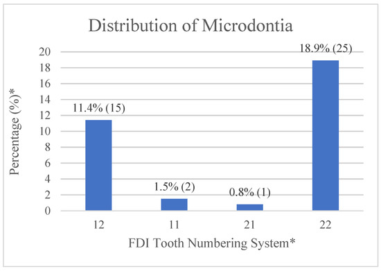 The distribution of microdontia. * (1) Tooth numbering is according to the Fédération Dentaire Internationale (FDI) tooth numbering system for maxillary and mandibular dentition. (2) Percentage of microdontia (number of each tooth site/total patient number (132)). (3) Numbers of microdontia for each tooth site are listed in the parentheses. (4) The third molars are not examined in this study.