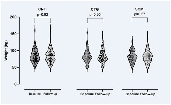The patients’ baseline characteristics were compared using one-way analysis of variance (ANOVA), the Kruskal–Wallis test and the Chi-square test, where appropriate. Weights at baseline and at one-year follow-up were compared using a paired t-test.