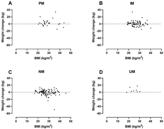 As the D’Agostino–Pearson test indicated that the residual values were not normally distributed, we conducted a complementary test excluding four patients identified as outliers. All patients had excessive weight changes (a female NM with a 23.9 kg weight loss and three males who were NM, IM and PM, two of whom had gained 33.9 and 34.0 kg and one who had lost 49.0 kg). In this analysis, the association between weight change and PM status remained but was no longer statistically significant (2.29 kg (95% CI: −0.37 to 4.94)). In contrast, the association between weight change and UM status remained statistically significant (6.72 kg (295% CI: 0.05 to 11.4)).
