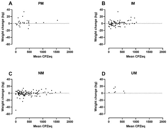 Weight change by average daily exposure to antipsychotics and CYP2D6 genotype in: PMs (=Poor metabolizers) (A); IMs (=Intermediate metabolizers) (B); NMs (=Normal metabolizers) (C) and; UMs (=Ultrarapid metabolizers) (D). CPZeq = Chlorpromazine equivalents.
