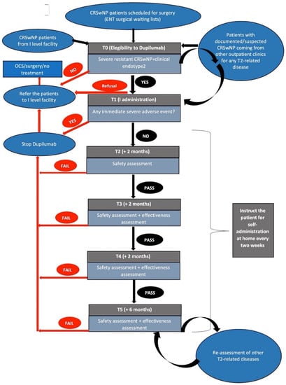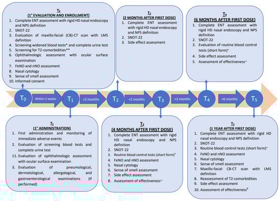 After collecting the patient’s case history, the first ENT examination (Time 0 or T0) focuses on confirming the presence of a severe and resistant CRSwNP and defining the endotype in each patient based on international guidelines [1,2,3,4,5,6,7,8,9,10,11].