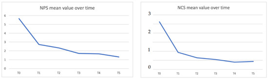 Dupilumab has been shown to be effective in reducing polyps’ volume (measured with Nasal Polyp Score) and restoring nasal congestion (measured with Nasal Congestion Score). The mean NPS score decreased significantly from 5.66 ± 1.42 at baseline to 1.71 ± 1.82 at 6 months (p < 0.05) and to 1.31 ± 1.70 at 12 months (p < 0.05). The mean NCS score decreased significantly from 2.63 ± 0.64 at baseline to 0.54 ± 0.64 at 6 months (p < 0.05) and 0.44 ± 0.63 at 12 months (p < 0.05). Figure 3 shows the NPS and NCS mean values over time.