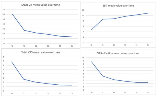 SNOT-22 (sinonasal outcome test),SSIT (sniffing sticks identification test), Total VAS (visual analogue scale) and VAS olfaction mean values over time.